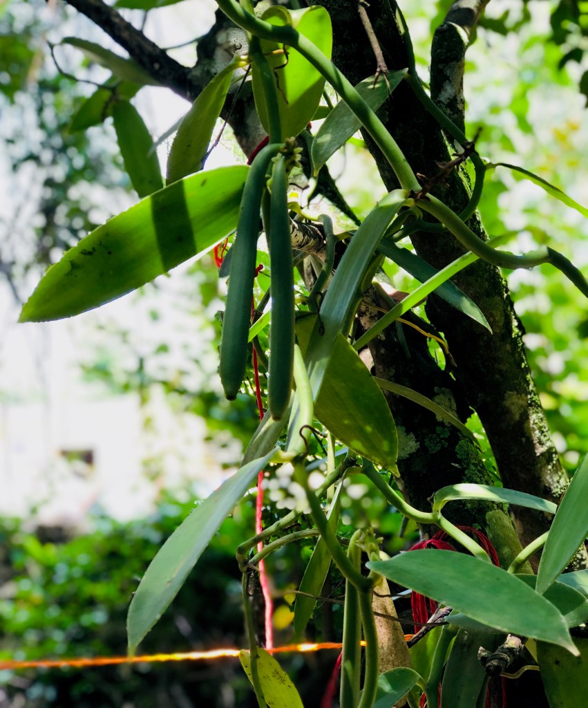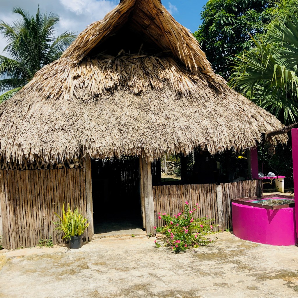 Our excursion continued with a tour of a lush, tropical garden filled with a variety of plants, tropical fruits, and a replica of a traditional Mayan dwelling. This was my first time to see vanilla beans growing.