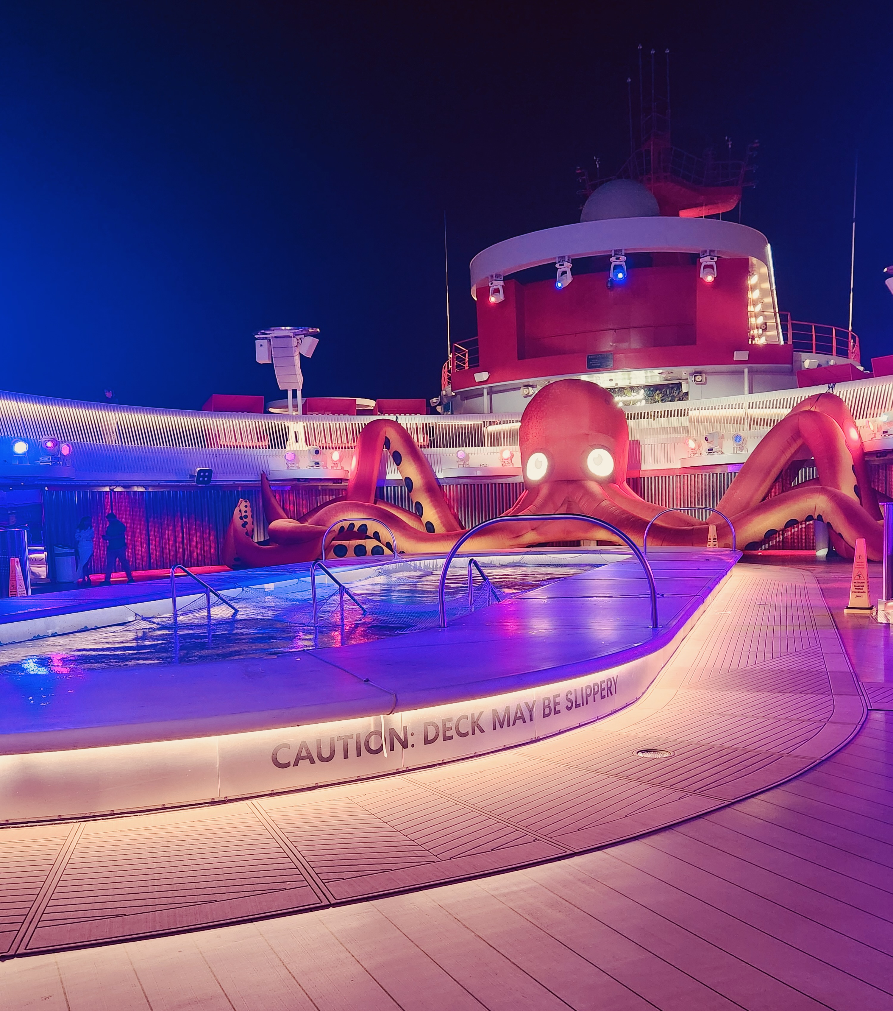 This is another place where Virgin is known to do things differently. The entertainment might be described as “edgy” – but one person’s “edgy” is just another person’s good fun! Virgin emphasizes a very welcoming, inclusive atmosphere, and that felt right to us. Scarlet night on the pool deck was a lot of fun!